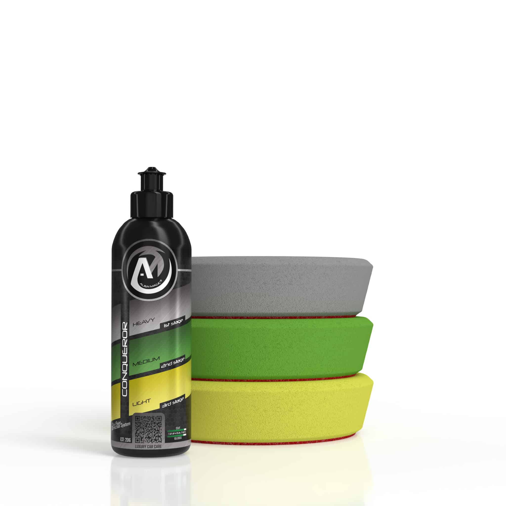 The Conqueror Paint Correction System comprises of the Conqueror All in 1 Compound and Conqueror Pads, continuous testing has ensured they work together flawlessly to achieve maximum results.Heavy, medium and light cut are all easily achieved with our terrific “3 in 1 paint correction system”.
