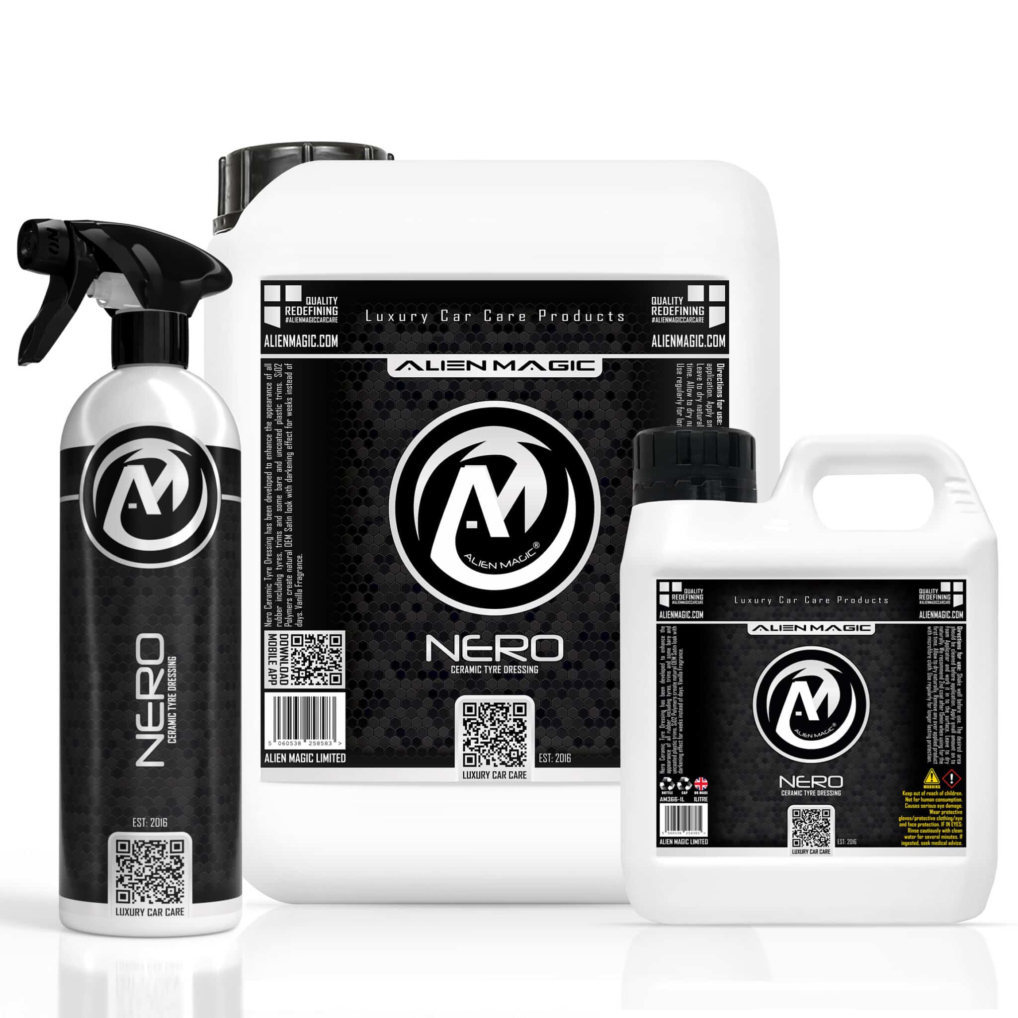 Tyre dressings provide a statement to the world, “my car has been freshly cleaned, is well looked after and is a joy to look at. For that reason, tyres should be dressed with a premium product that darkens, restores and protects. Alien Magic Nero is that product.